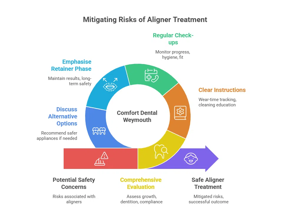 - At Comfort Dental Weymouth, we recommend parents engage in the process: set routines, track wear time, assist with cleaning and storage of aligners, and ensure regular follow-ups.