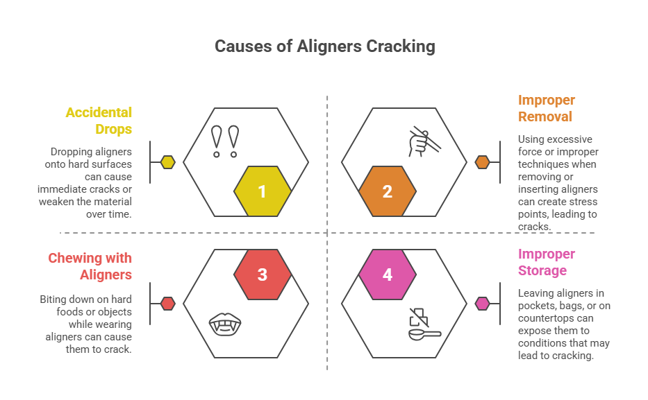• Improper Removal or Insertion: Using excessive force or improper techniques when removing or inserting aligners can create stress points, leading to cracks.
