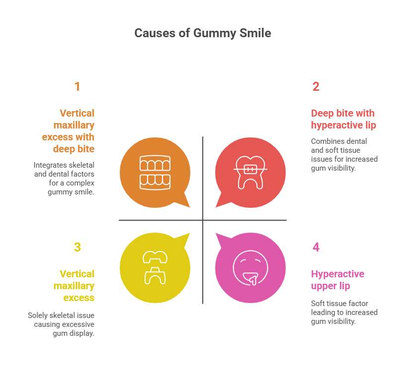 Your orthodontist will assess gum-to-tooth ratio, upper-jaw position, tooth eruption levels, lip mobility, and take imaging/scans to isolate the cause.