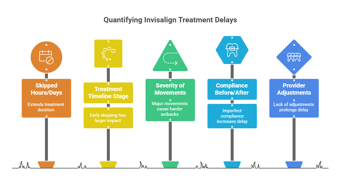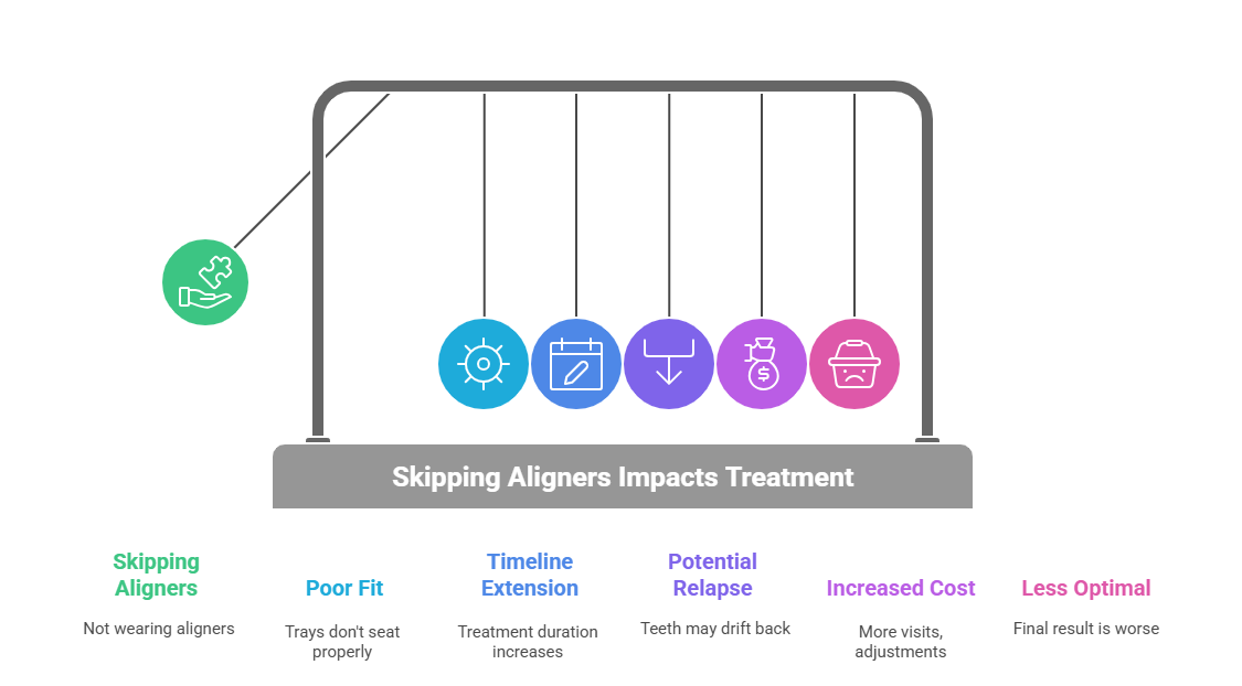 Imagine you normally switch trays every 2 weeks. If you skip one night’s wear (losing 8 hours), and that happens infrequently it may only delay your tray switch by a day or two. But if you begin skipping several nights a week, that delay grows, the next trays may not fit, and you might require supplementary alignment or refinements — increasing visits and cost.