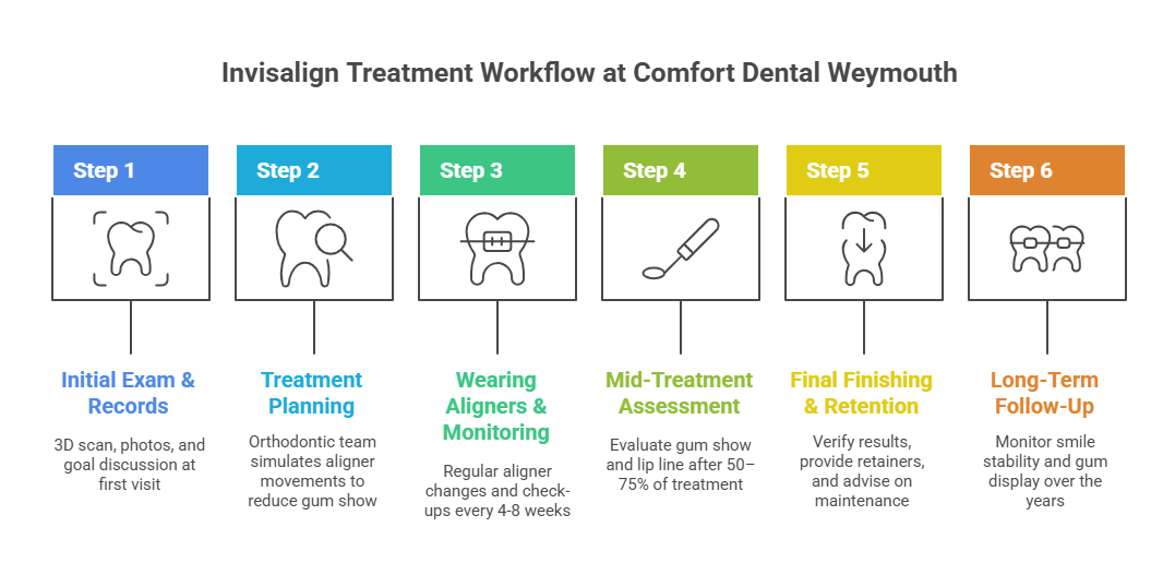 In such cases a combined approach works best: Invisalign for tooth/bite alignment, plus gum contouring (laser or surgical) and possibly orthognathic surgery for jaw issues. Comfort Dental Weymouth will coordinate referrals if needed.