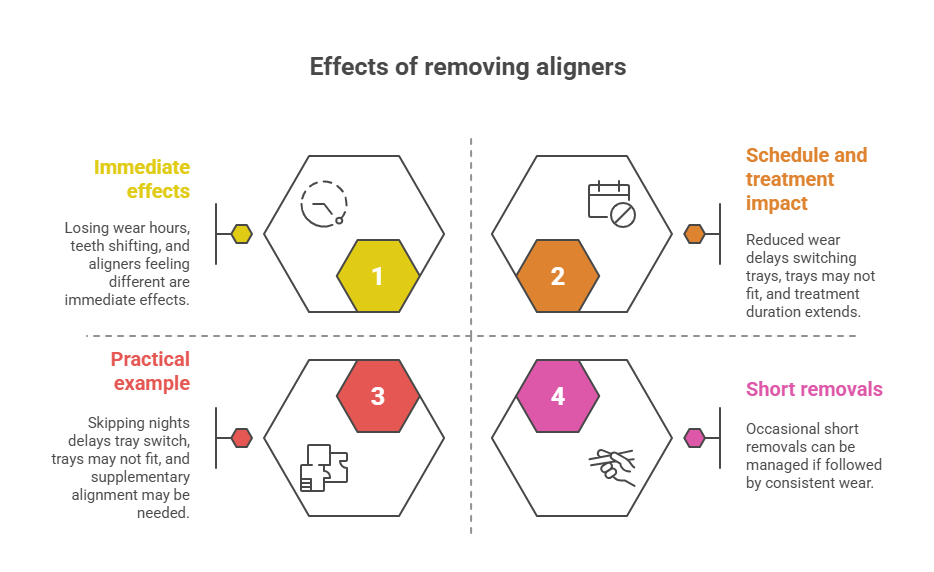 If you regularly take out your aligners at night, the cumulative loss of wear time becomes significant. For example: removing aligners for 8 hours nightly means you may only wear them for ~12–14 hours/day instead of the recommended 20‑22. That’s a loss of ~6–10 hours per day, or ~42–70 hours per week. That deficit can stall movement.