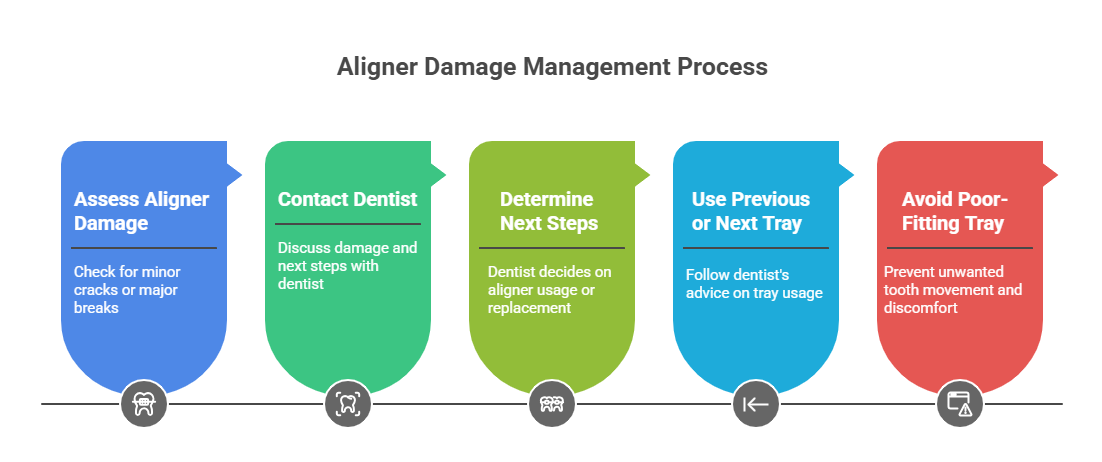 • Answer: Contact your orthodontist immediately for guidance on replacing the broken aligner.