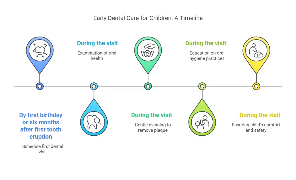 The American Academy of Pediatric Dentistry recommends scheduling your child’s first dental visit by their first birthday or within six months after the first tooth erupts. This early introduction helps establish a dental home and promotes preventive care.