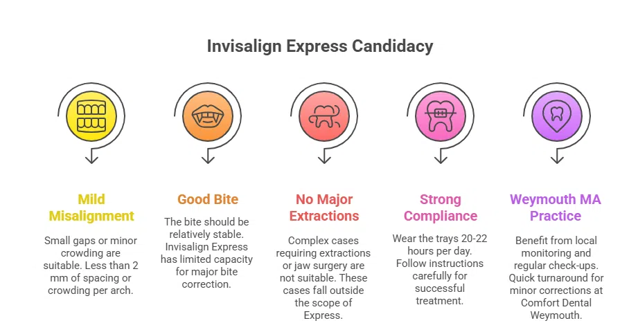 If during evaluation your case is deemed too complex, your provider (for example at Comfort Dental Weymouth) will likely recommend a full Invisalign plan. Some practices may allow you to upgrade from Express to full if needed. - Do I need a retainer after Invisalign Express?