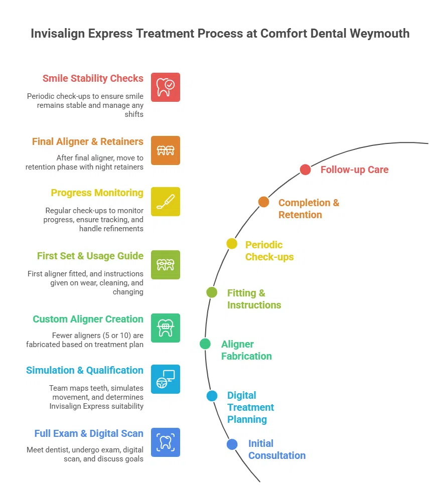 - Initial Consultation – You’ll meet with the dentist at Comfort Dental Weymouth for a full exam, digital scan, photos and discussion of your goals (“Comfort Dental Weymouth Invisalign Express consultation Weymouth MA”).