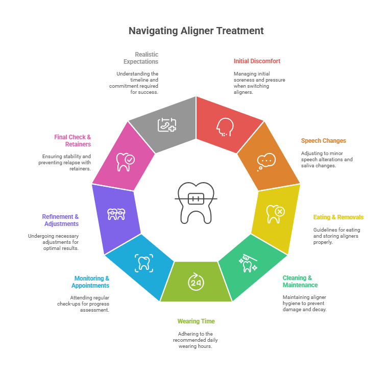 - After completing active aligner wear, retainers (often clear plastic) are provided to maintain your results.