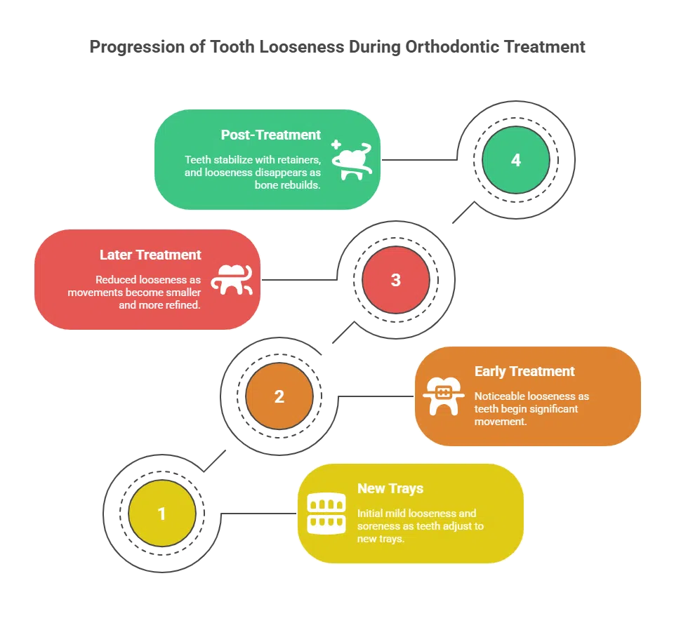 - Post-treatment: Retainers stabilize teeth, and the loose feeling disappears as bone fully rebuilds.